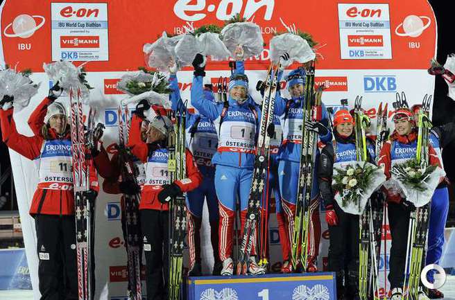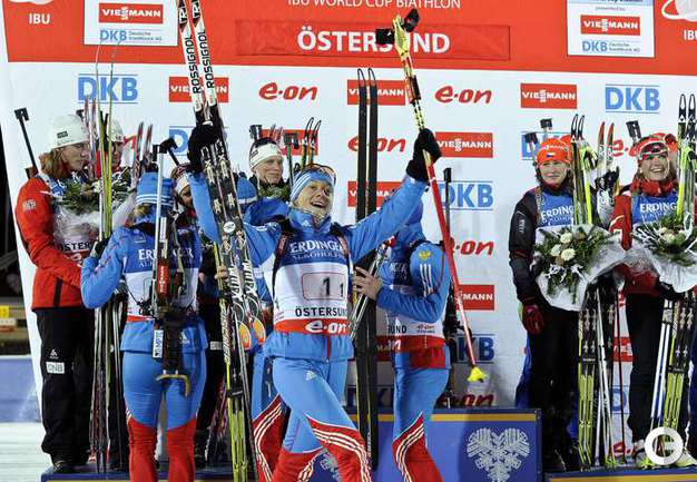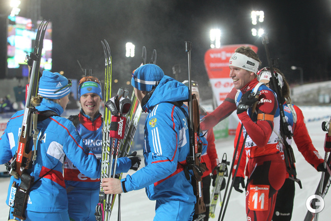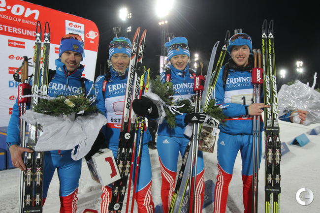 Эстерсунд (Швеция). Кубок мира. Первый этап. Смешанная эстафета, 2х6 + 2х7,5 км. Сборная России в составе Ольги Зайцевой, Ольги Вилухиной, Алексея Волкова и Евгения Устюгова добилась победы в смешанной эстафете в рамках первого этапа Кубка мира в Эстерсунде - стартовой гонке нового сезона. Второй финишировала сборная Норвегии, третьей - Чехии. Фото AFP и Евгений Тумашов, СБР