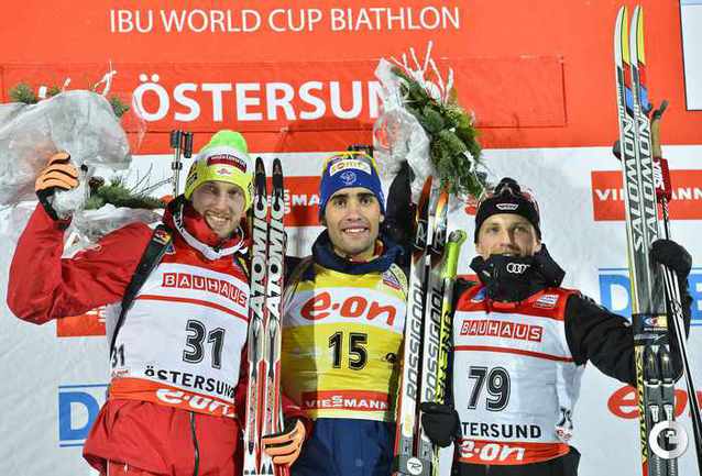 Эстерсунд (Швеция). Кубок мира. Мужчины. Индивидуальная гонка. 20 км. 1. М. Фуркад (Франция) - 50.44,7 (1 промах). 2. Ландертингер (Австрия) - отставание 12,3 (1). 3. Лессер (Германия) - 21,7 (0). Лучший из россиян Евгений Устюгов стал пятым. Фото REUTERS и AFP