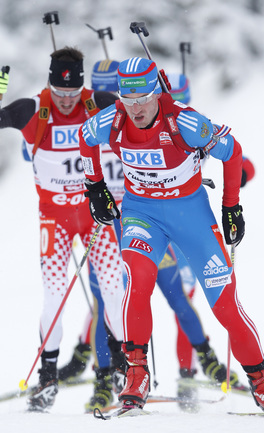 08.12.2012. Биатлон. Хохфильцен. Кубок мира. Мужчины. Гонка преследования. 12,5 км. 1. Фак (Словения) - 34.14,8 (2 шт.круга). 2. МАЛЫШКО (Россия) - отставание 0,9 (1). 3. М. Фуркад (Франция) - 8,6 (3). Фото AFP, REUTERS