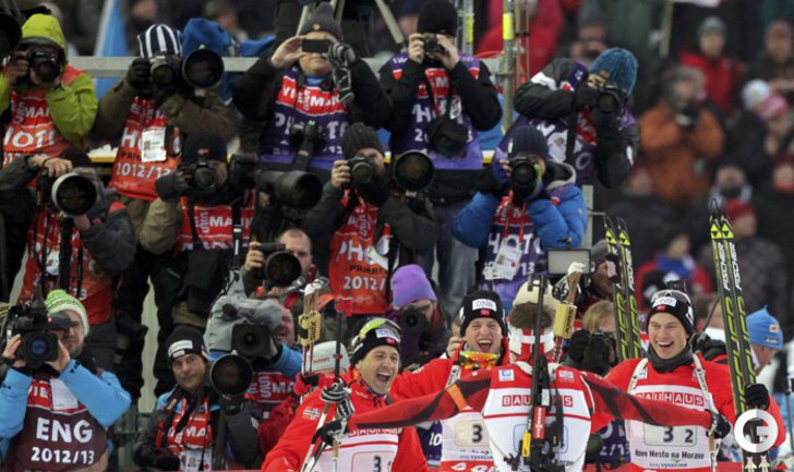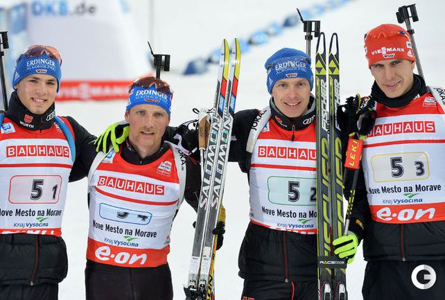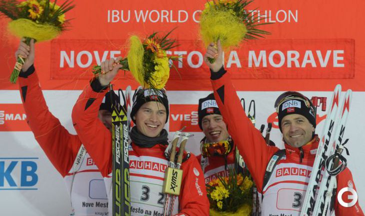 Биатлон. Нове-Место. Чемпионат мира. Эстафета, 4 х 7,5 км. Мужчины. 1. Норвегия (Бьорндален, Х. Л`Абе-Лунн, Т. Бе, Свендсен) - 01:15.39,01 (0 шт. кругов + 5 доп. патронов) 2. Франция (С. Фуркад, Беатрикс, Беф, М. Фуркад) - отставание 1.12,7 (0 + 7) 3. Германия (Шемп, Бирнбахер, Пайффер, Лессер) - 1.18,5 (2 + 3) 4. РОССИЯ (ШИПУЛИН, УСТЮГОВ, ГАРАНИЧЕВ, МАЛЫШКО) - 1.24,1 (2 + 7) 5. Австрия (С. Эдер, Д. Мезотич, Ландертингер, Зуманн) - 1.38,9 (0+5) 6. Чехия (Шлезингер, Моравец, Сукуп, Крчмарж) - 2.50,0 (0+9). Фото AFP, REUTERS
