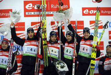 Эстерсунд (Швеция). Кубок мира. 1-й этап. Мужчины. Эстафета 4х7,5 км. 1. Франция (Же, Дефран, С. Фуркад, М. Фуркад) - 1:15.10,30 (1 штрафной круг + 7 дополнительных патронов). 2. Норвегия (Свендсен, Ус, Л. Бергер, Бьорндален) - отставание 13,7 (3 + 11). 3. Австрия (Д. Мезотич, С. Эдер, Ландертингер, Зуманн) - 18,2 (1 + 7). 4. РОССИЯ (ЧЕРЕЗОВ, УСТЮГОВ, ВАСИЛЬЕВ, ЧУДОВ) - 29,7 (1 + 8). 5. Германия (Штефан, Бирнбахер, Пайффер, Грайс) - 39,8 (3 + 7). 6. Швеция (Линдстрем, Ферри, Нильссон, Бергман) - 43,9 (0 + 9)…