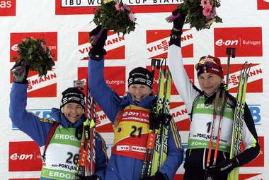 Кубок мира. Женщины. Общий зачет. 1. Юнссон - 277 очков. 2. Олофссон-Зидек - 234. 3. Медведцева - 184. 4. Слепцова (Россия) - 152. 5. Т. Бергер (Норвегия) - 146. 6. Кузьмина - 137… 9. Зайцева (Россия) - 125… 19. Романова - 78… 28. Булыгина - 57… 33. Бурдыга - 51… 38. Богалий-Титовец - 38… Индивидуальная гонка. 1. Юнссон - 120 очков. 2. Олофссон-Зидек - 108. 3. Вал. Семеренко - 74. 4. Домрачева (Белоруссия) - 73. 5. Кузьмина - 71. 6. Медведева - 68…