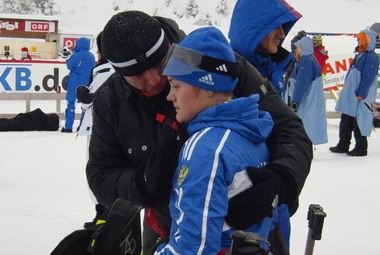 После неудачной для команды эстафетной гонки завершившая первый этап на первом месте Светлана Слепцова нашла слова утешения для завернувшей на штрафной круг Екатерины Юрловой.
