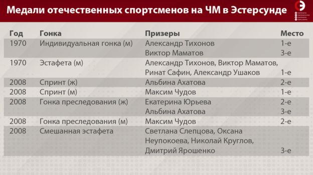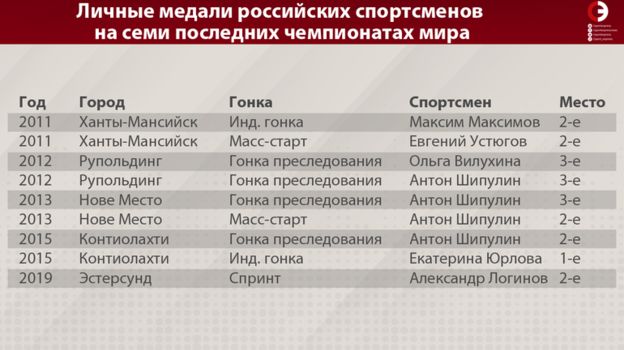 На семи чемпионатах мира после Олимпиады в Ванкувере российские спортсмены завоевали всего девять личных наград, причем золото смогла добыть только Екатерина Юрлова в индивидуальной гонке в Контиолахти. Четыре медали заработал Антон Шипулин, по одной кроме Юрловой и Логинова взяли Максим Максимов, Евгений Устюгов и Ольга Вилухина.