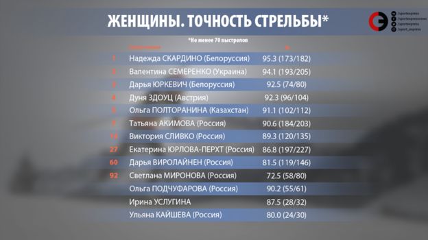 Все остальные восемь самых точных биатлонистов в пелотоне на финише далеки от лидирующих позиций. Вы что-нибудь слышали про представительницу Австрии Дуню Здоуц или бельгийского биатлониста Флорана Клода? Между тем, они оба стреляют фантастически здорово – под 93 процента точных попаданий. Но с их скоростью на лыжне это вообще ничего не значит.