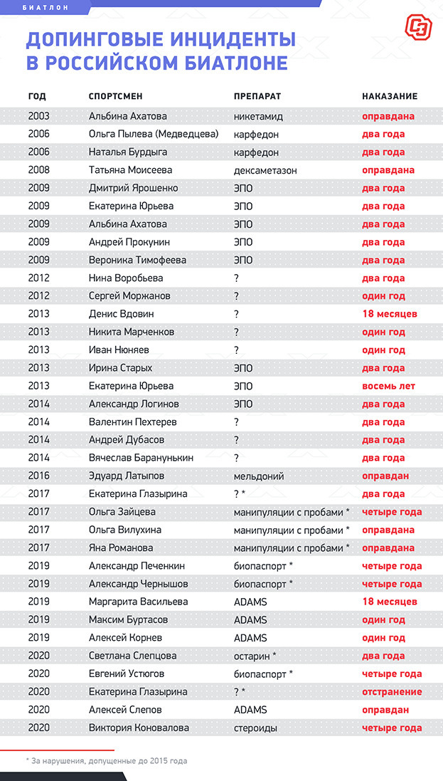 Да, еще были инциденты с пропущенными допинг-тестами — это нарушение тоже косвенно указывает на возможное мошенничество, но реально пойманных на запрещенке у нас не было более шести лет. Возможно, тренеры и спортсмены действительно понимали ситуацию, в которой мы находимся, ожидая новых дисквалификаций от IBU буквально в любой момент. Ведь с 2006 года в антидопинговые жернова уже угодили 26 наших биатлонистов — хуже в России ситуация только в легкой и тяжелой атлетике. Кроме того, регулярно появлялись новости о том, что ВАДА передала в IBU дела на еще несколько десятков подозреваемых на основании базы LIMS.