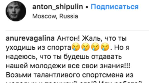 "Антон! Жаль, что ты уходишь из спорта. Но я надеюсь, что ты будешь отдавать нашей молодежи все свои знания!!! Возьми талантливого спортсмена из молодых и тренируй его! Или работай спортивным юристом, защищай наших спортсменов!!! Успехов тебе в Жизни!!!! Она ведь только начинается!!!!"