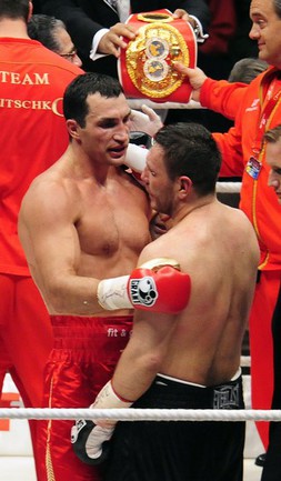 Минувшей ночью в Гельзенкирхене Владимир Кличко защитил звание чемпиона мира в супертяжелом весе по версиям IBF, WBO и IBO, победив техническим нокаутом Руслана Чагаева. Бой прошел с преимуществом украинца: во втором раунде Кличко-младший послал соперника в нокдаун, а в восьмом у боксера из Узбекистана открылось рассечение над левым глазом. В перерыве между девятым и десятым раундами повреждение Чагаева обследовал доктор Штефан Бок, после чего было принято решение остановить поединок. |