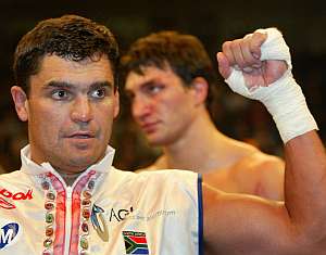 Украинец Владимир Кличко проиграл в бое за звание чемпиона мира в супертяжелой весовой категории по версии WBO южноафриканцу Корри Сандерсу. На 27-й секунде второго раунда судья зафиксировал технический нокаут. Еще в первом раунде Кличко, в шестой раз защищавший свое чемпионское звание, пропустил мощный удар левой. После этого он еще трижды оказывался на полу. Несмотря на безоговорочное поражение в Ганновере, украинский великан не оставляет надежд побить Леннокса Льюиса и стать лучшим в мире. Владимир заявил, что все великие чемпионы проигрывают, а потом триумфально возвращаются. |