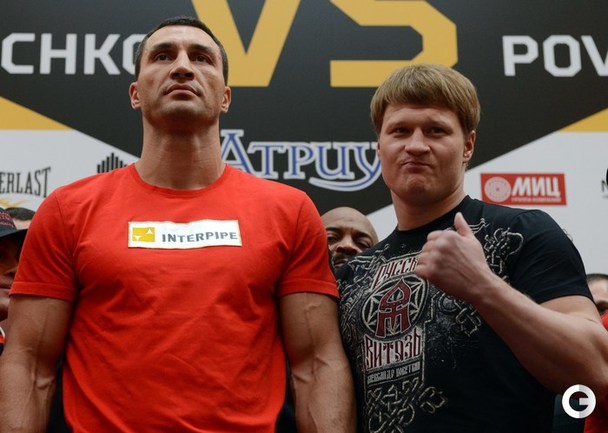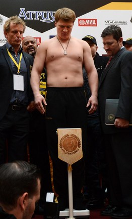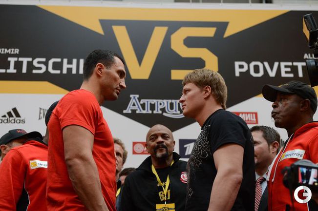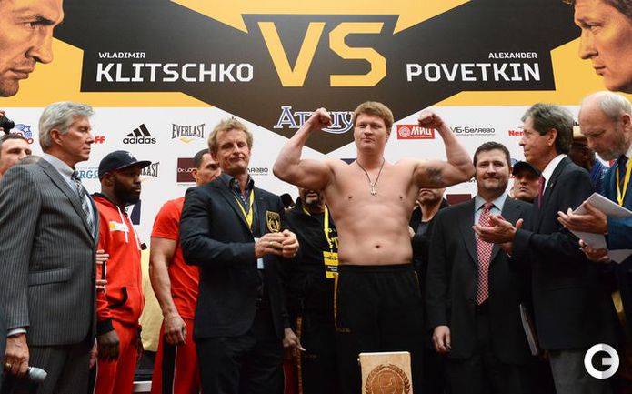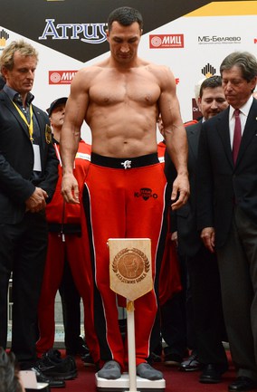 Москва. Владимир Кличко оказался тяжелее Александра Поветкина на взвешивании, состоявшемся сегодня в Москве. Вес украинца накануне боя составил 109,6 килограмма, а россиянина – 102,4. Фото AFP, REUTERS