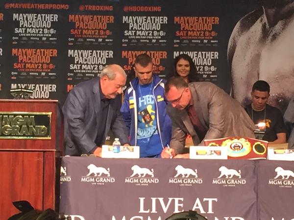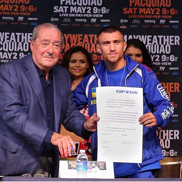 Чемпион мира по версии WBO в полулегком весе Василий Ломаченко во время пресс-конференции накануне боя против пуэрториканца Гамалиера Родригеса подписал новый контракт с промоутерской компанией Top Rank. которую возглавляет Боб Арум, сообщает официальный сайт 27-летнего украинца. Новое соглашение между сторонами рассчитано на пять лет. Поединок Ломаченко с Родригесом состоится 2 мая на вечере бокса в Лас-Вегасе, где главным событием будет встреча чемпиона мира в пяти весовых категориях Флойда Мейуэзера с обладателем титула WBO в полусреднем весе Мэнни Пакиао.