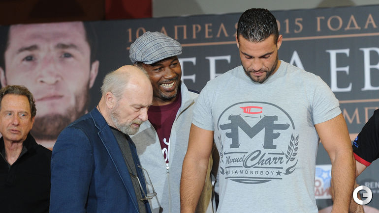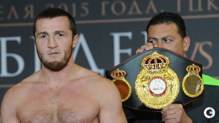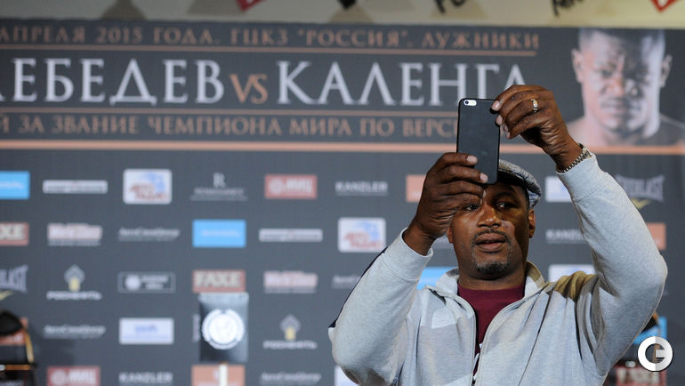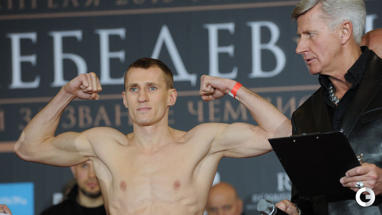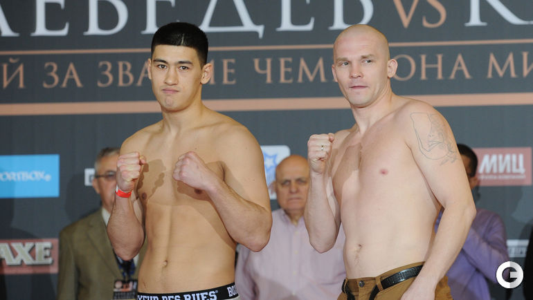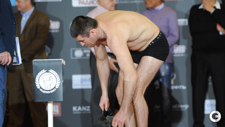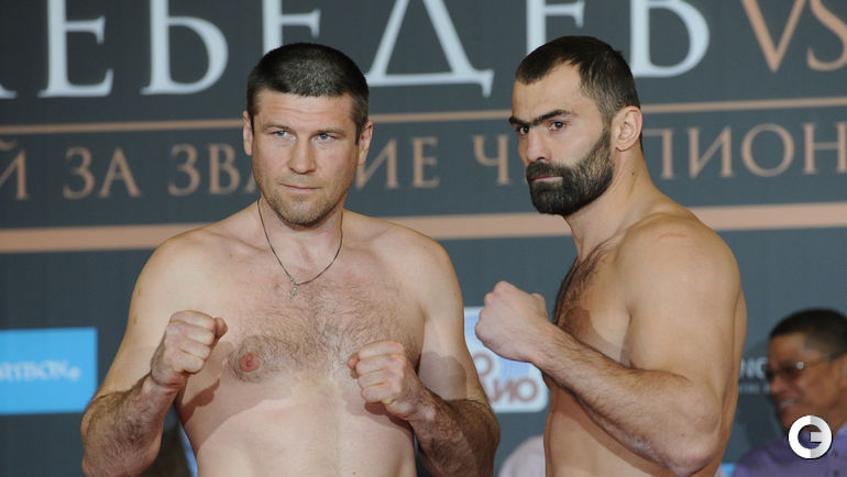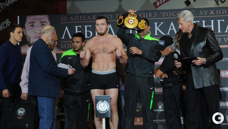Россиянин Денис Лебедев на церемонии взвешивания оказался легче соперника француза Йоури Каленга на 100 граммов. Бой пройдет 10 апреля в Москве. На кону титул чемпиона мира по версии WBA в весовой категории до 90,9 кг. Фото - Федор Успенский, "СЭ"