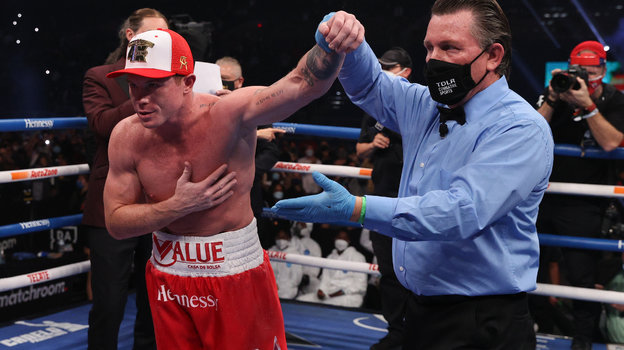 20 процентов арены «Аламодоум» в Техасе — это 15 тысяч человек. И это все равно очень много. В основном, конечно, это были мексиканцы, а не «реднеки» с пушками. Для них был красочный выход Сауля Альвареса — с огнями, с мариачи, даже и не скажешь через несколько лет, что бой проходил во времена пандемии. Разве что ринг-анонсер Майкл Баффер, работавший, видимо, из обитой войлоком комнатки — на арене его фигуру, предварительно отснятую, вывели на экран. При этом на зал работал не менее крутой Дэвид Диаманте. В какой-то момент в трансляции было даже слышно, как голос одного ведущего перекрывает голос другого, и звучало это крайне странно. Словно праздник пошел не по плану.