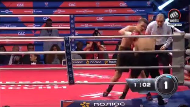 Менее минуты, и рефери отсчитывает секунды после нокдауна. Оправился, но вскоре останавливают схватку.