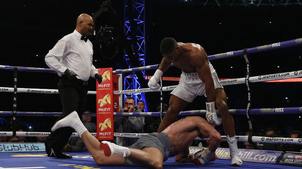 ???Apr?s un UPPERCUT hallucinant du droit et un encha?nement ?norme, Joshua fait chuter Klitschko et remporte le match au KO technique ! ??? pic.twitter.com/M9yVrB2vsE