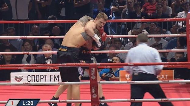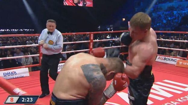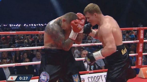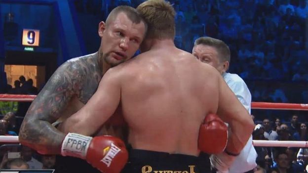 Поветкин бьет сдвоенный апперкот, развивает атаку левым боковым и затем выбрасывает длинный правый крюк, который проходит над головой Руденко, зацепив слегка по затылку. Руденко крутит головой и показывает рефери на свою шею – что-то не в порядке. В бою случилась затяжная пауза, пока принималось решение, может ли украинский боксер продолжить поединок или нет
