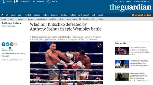 В один момент Джошуа сказал репортеру Guardian: "У меня нет ненависти к Кличко, нет неприязни. Я хочу побить Кличко". Это именно то, что он сделал, не только разрушив упорную защиту украинского спортсмена, но и высмеяв тем самым сообщение с прогнозом, которое Кличко записал до боя, где он объясняет, как победит Джошуа. Если новый британский чемпион когда-либо доберется до этой записи, он, несомненно, будет смеяться всю дорогу до своего банка в новом автомобиле, который ему доставили на прошлой неделе.