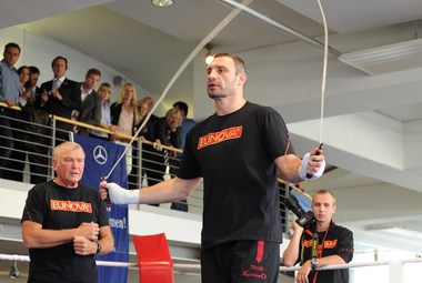 Виталий понимал, что ничего серьезного в такой обстановке делать невозможно, и начал с того, что заявил: у него много тренеров и он хочет их всех представить. У Фрица Здунека, стоявшего в углу, слегка вытянулось лицо. Это явно был экспромт. Виталий сказал, что у него самый лучший в мире тренер по ОФП, и его зовут Фриц Здунек. Тот улыбнулся, но явно не знал, что будет сказано после этого. Тогда Виталий продолжил, сказав, что у него лучший в мире тренер по постановке удара, и его зовут Фриц Здунек. В ответ тот заулыбался совсем уж широко. Вслед за этим он оказался лучшим в мире тренером по повышению выносливости и по психологической подготовке.