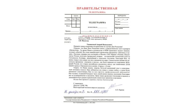 Желаем Вам, уважаемый Андрей Васильевич, крепкого здоровья и новых достижений! Мы рады поддержать вашу кандидатуру на выборах президента Российской шахматной федерации, которые пройдут в феврале 2018 года. Мы вместе продолжим работу по развитию и популяризации шахмат в нашей стране.