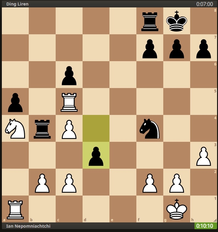Перекусили, попили конфе — и снова партия. В 14:13 по московскому времени Непомнящий и Дин Лижэнь начали третью партию.