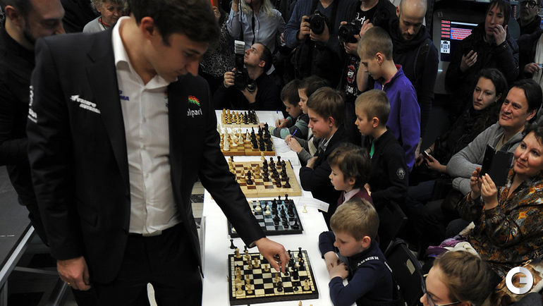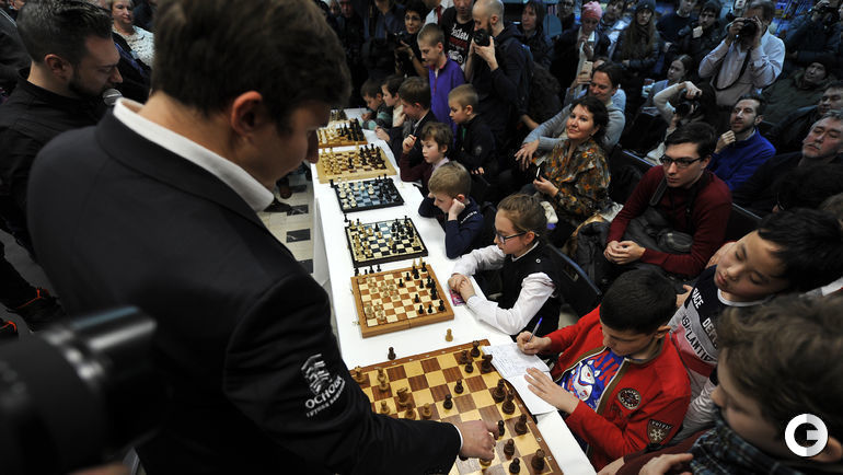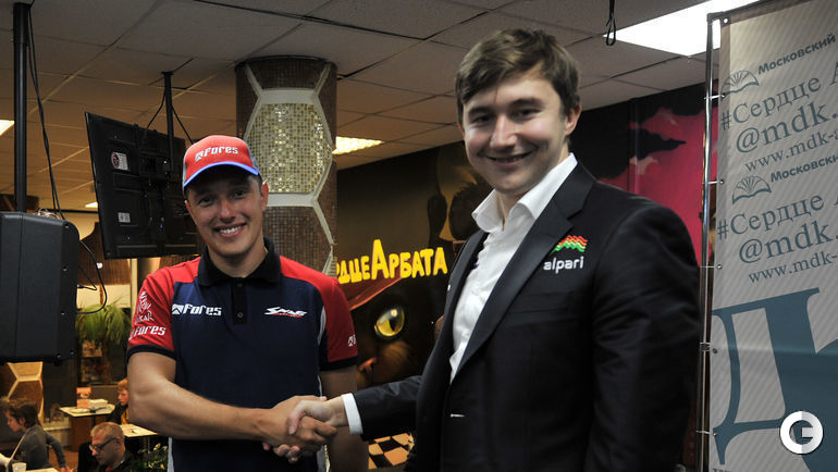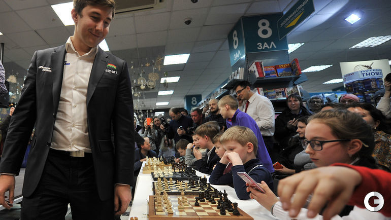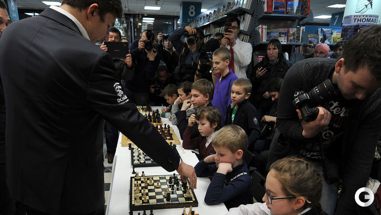 В Московском доме книги состоялось творческая встреча с одним из самых успешных российских шахматистов – вице-чемпионом мира Сергеем Карякиным. В этот вечер у всех гостей была возможность лично поздравить Сергея Карякина, задать ему вопросы, получить памятный автограф, а под занавес вечера гроссмейстер провел сеанс одновременной игры с воспитанниками шахматных школ Москвы.