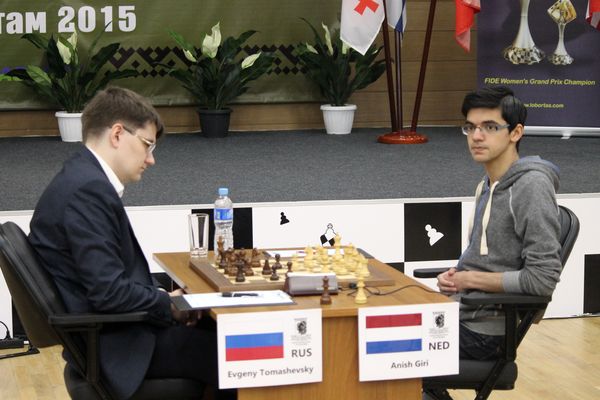 Создав фигурное давление на королевском фланге, белые вынудили соперника предложить размен белопольных слонов. После этого Аниш отыграл пешку а4, зато Евгений провел важный прорыв в центре d6-d5. Возникла позиция динамического равновесия. Однако практически сразу после этого черные стали играть излишне пассивно, хотя от них требовались более активные действия. Белые удачно перегруппировались и повели наступление на королевском фланге. Испытывая недостаток времени, Томашевский допустил несколько неточностей и попал под атаку. На 58-м ходу черные признали свое поражение.
