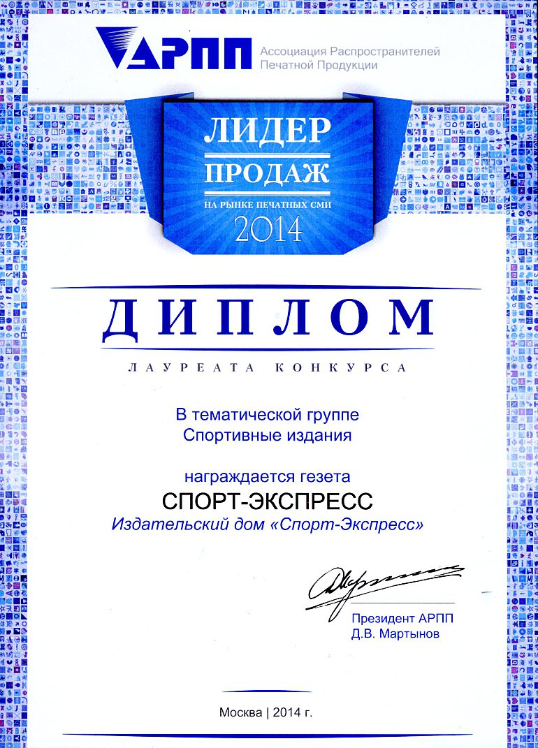 Издательский дом "Спорт-Экспресс" награжден дипломом, как лидер продаж в 2014 году в номинации "Спортивные издания" по версии Ассоциации распространителей печатной продукции (АРПП).
