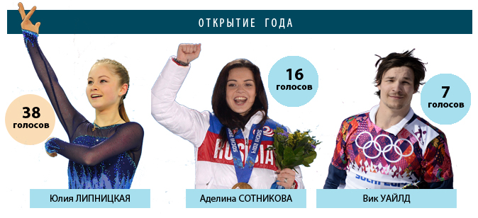 В голосовании Липницкая набрала 38 голосов. Следом – олимпийская чемпионка Сочи в одиночном катании Аделина Сотникова (16), замкнул тройку обладатель двух золотых медалей Игр-2014 в сноубороде Вик Уайлд (7).