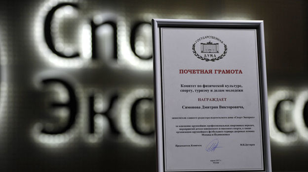 Заместитель главного редактора ИД "Спорт-Экспресс" Дмитрий СИМОНОВ стал обладателем почетной грамоты от Комитета по физической культуре, спорту, туризму и делам молодежи Государственной думы РФ. Наш журналист отмечен за освещение крупнейших профессиональных спортивных турниров и мероприятий детско-юношеского и массового спорта, а также за активное участие в проведении Турнира дворовых команд "СЭ" (ТДК) – крупнейшего соревнования любительских команд Москвы и Подмосковья. Грамота подписана главой комитета Михаилом Дегтяревым.