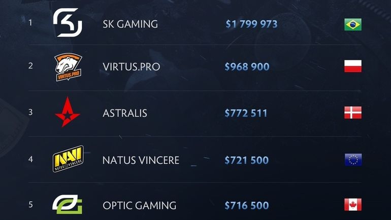 Портал cybersport.ru подсчитал общую сумму призовых, заработанных командами по Counter Strike: Global Offensive за 2016 год. Возглавил рейтинг победитель двух major-турниров в уходящем году – бразильская SK – с показателем почти 1,8 миллиона долларов. На второй строчке расположилась польская пятерка российской организации Virtus.pro. "Медведям" удалось заработать 968 тысяч долларов. Украинская Natus Vincere заняла четвертое место в списке с показателем 721 тысяча долларов.