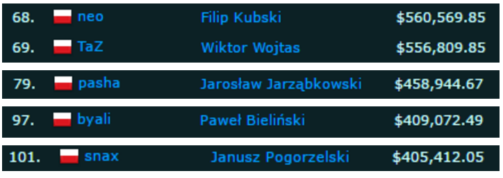 После второго места на прошедшем ELEAGUE Major польская пятерка по CS:GO российской организации Virtus.pro вышла на первое место по общей сумме заработанных призовых в данной дисциплине, сообщает pvplive.net. Все игроки текущего состава "медведей" преодолели отметку 400 тысяч долларов призовых. В сумме игроки завоевали почти 2,4 миллиона долларов на чемпионатах по Counter-Strike, включая версию 1.6. Лидером среди поляков является Филип "Neo" Кубски с показателем 560 тысяч долларов.