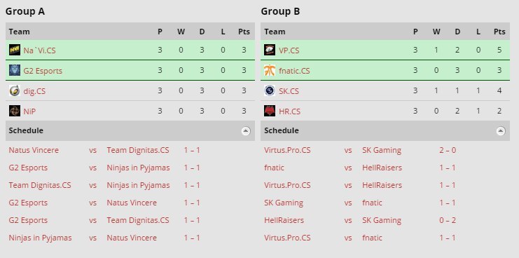 Какими бы яркими ни были декорации, главное в любом турнире – это уровень и качество игры. Групповой этап показал, что на проходные матчи не стоит надеяться никому. Восемь коллективов были поделены на две группы. Победители прошли сразу в полуфинал, а четвертые команды покинули турнир. Участники, занявшие вторую и третью строчку, начнут борьбу с четвертьфинальной стадии. По результатам трех туров в квартете А все команды имели по 3 очка, а места в группе распределялись по показателю набранных раундов. Так за бортом стадии play-off остался один из фаворитов турнира – шведская NiP, занимающая четвертую позицию в рейтинге hltv.org.