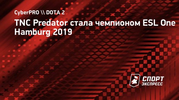 TNC Predator победила на ESL One Hamburg 2019 по Dota 2 и получила 125 тысяч долларов. В решающем матче турнира коллектив обыграл Gambit Esports со счетом 3:2.