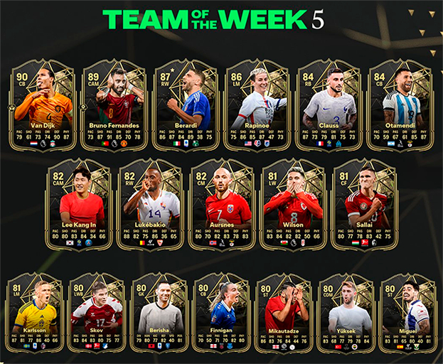 Компания EA Sports представила пятую команду недели нового футбольного симулятора FC 24 (продолжение FIFA 23), игроков которой можно использовать в режиме Ultimate Team. Она составляется на основе реальных заслуг игроков в этот промежуток времени.
