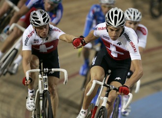 Швейцарские велосипедисты празднуют победу в мэдисоне