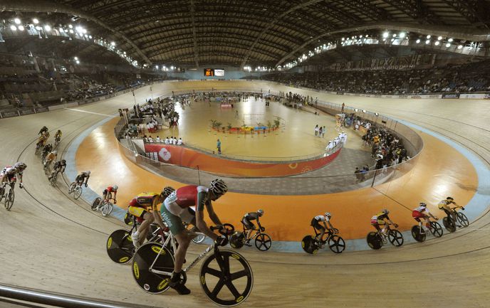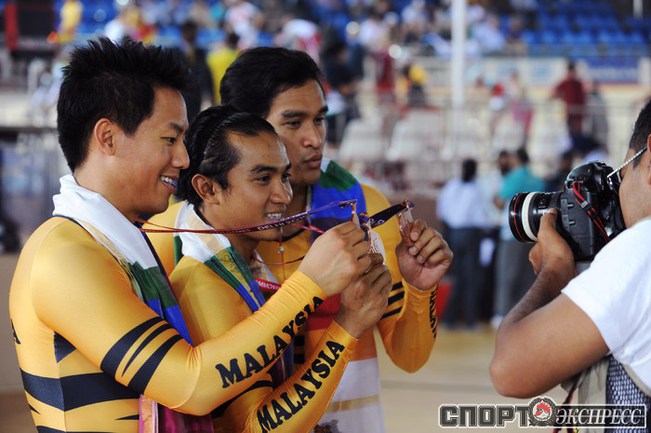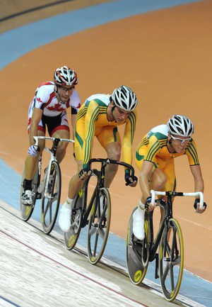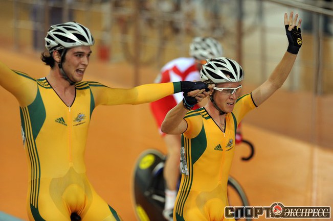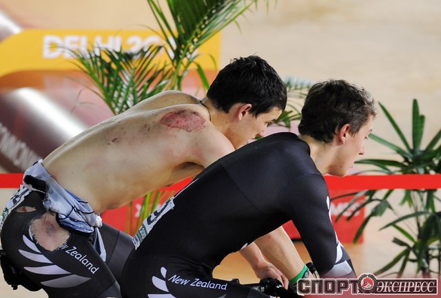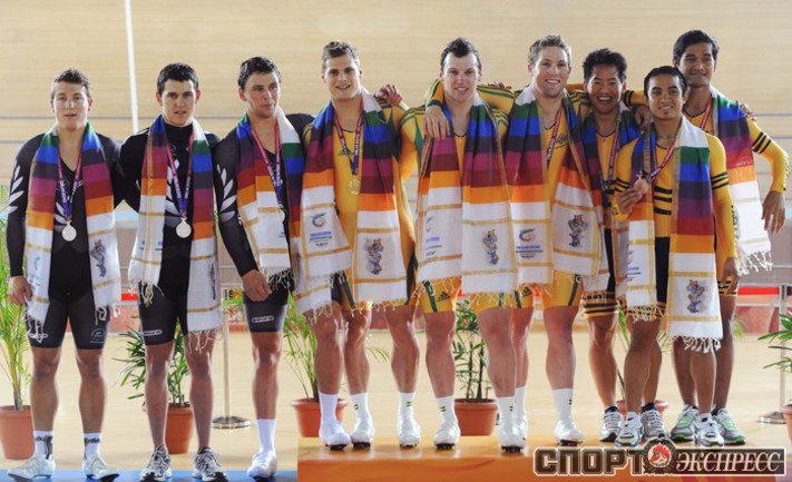 08.10.2010. Дели. Велосипедисты в комплексе Индиры Ганди Спортс во время XIX Игр Содружества. Камерон Мейер Австралии выиграл золото, поскольку соотечественник Майкл Фреиберг взял серебро, и Марк Райан Канады взял бронзу. Фото AFP