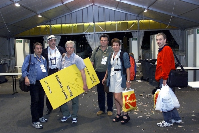 2000 год. Сидней. Олимпийская бригада "СЭ" (слева направо): Сергей РОДИЧЕНКО, Лев РОССОШИК, Владимир ГЕСКИН, Александр ПРОСВЕТОВ, Елена ВАЙЦЕХОВСКАЯ, Максим СМИРНОВ. Фото - Александр ВИЛЬФ