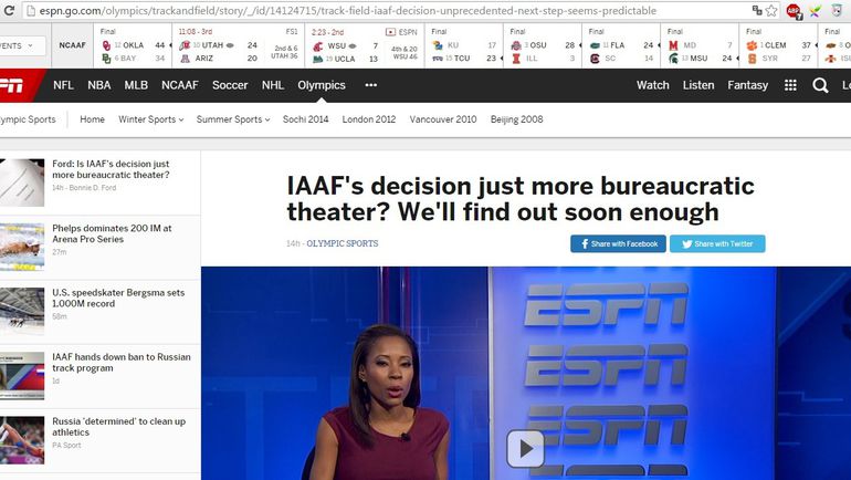"Решение IAAF – еще один бюрократический театр? Мы узнаем достаточно скоро, – так оценила аналитик ESPN решение об отстранении российских легкоатлетов. – Они приняли решение, которое ожидалось. Это было единственное, что они могли сделать, за исключением того, чтобы не делать вообще ничего".