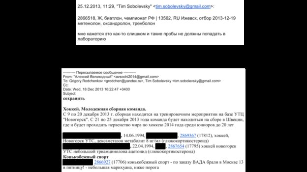 Соболевский фактически руководил всей оперативной работой лаборатории. Мог ли он при этом не знать обо всех манипуляциях? Ответ на этот вопрос есть во второй части доклада Макларена. Электронный адрес Соболевского присутствует в нескольких переписках, причем его – сознательно или нет – вадовцы даже не закрыли черным квадратом. В частности, именно Соболевский 25 декабря 2013 года отправил письмо о некой пробе, взятой во время "Ижевской винтовки": "Мне кажется, это как-то слишком и такие пробы не должны попадать в лабораторию".