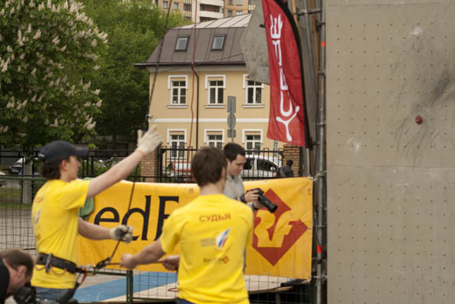 Сигналом к началу финала (по программе в час дня) послужил раскат грома. На Москву обрушилась гроза. Так что в финале ребята соревновались не только друг с другом, но и с дождем, с завидным упорством окатывавшим участников, скалодром и судей.