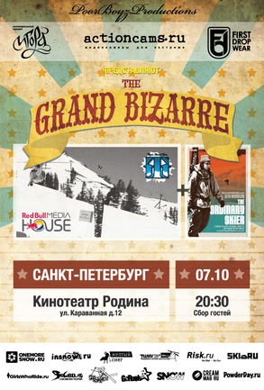 Уже в эту пятницу, 7 октября в Питере состоится премьера лучшего фильма года "The Grand Bizarre" от легендарных Poor Boyz Productions. Фильм получил громкий статус "лучшего freeski видео года" на престижном кинофестивале лыжного видео IF3 (International Freeski Films Festival) в Монреале.