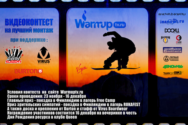 В результате победитель конкурса Warm Up TV получит путевку в Руку в лагерь Free Camp. Но это еще не все, за второе и третье место Warmup TV вручит доску и, соответственно, крепления от Burton! А также всяческие бонусы от Virus boardwear.