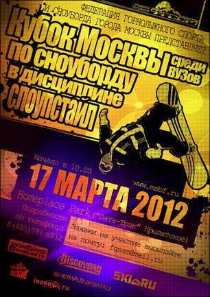 17 марта федерация горнолыжного спорта и сноуборда города Москвы при поддержке Traektoria Boardshop проведет в Крылатском два контеста в дисциплине "слоупстайл". В эту субботу все студенты приглашаются на студенческие соревнования по сноуборду. Кроме того, пройдет второй контест для всех желающих, кто не является студентом!