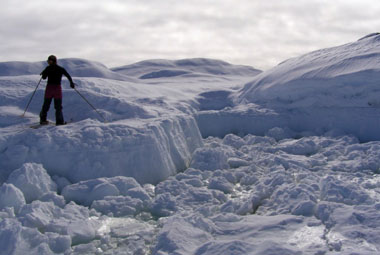 Добираемся до берега Сермилик-фиорда. По пути встречаем большое количество тюленей. На первый взгляд, этот огромный фиорд выглядит не сильно изменившимся за наше отсутствие. Начинаем пересечение. Как и в первый раз, двигаться быстрее, чем один км в час, не получается – по всей ширине фиорда путь преграждают торосовые "заросли". Не доходя до середины фиорда, я, идущий впереди, неожиданно проваливаюсь под лед. Ничего не предвещало такого происшествия...