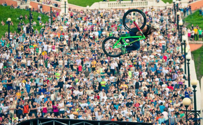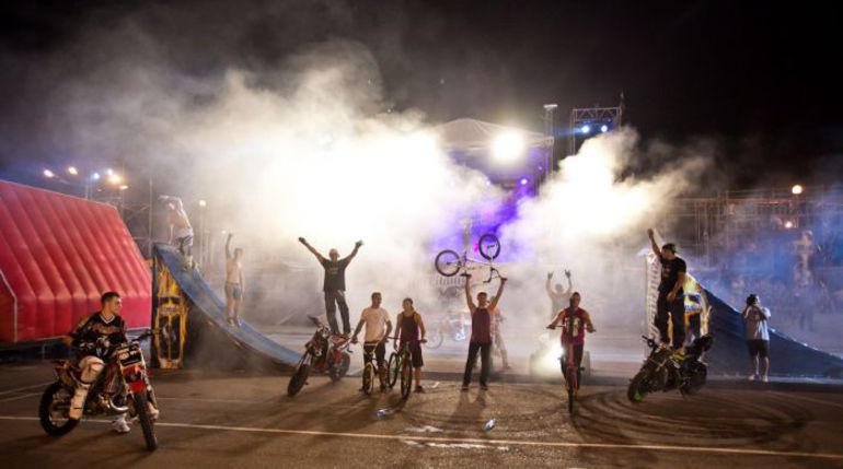 И творилось настоящее безумие: сумасшедшие дрифты на грани фола, проезды на заднем колесе и стоппи от стантрайдеров, которые, не жалея резину, заполняли площадку дымом и запахом адреналина. Совершенно запредельные прыжки велосипедистов – ребята, поднимаясь на разгонку, загорались от поддержки огромной толпы и творили чудеса в воздухе, в перерывах между прыжками демонстрируя пластику тела в танце. Кстати, в одном из городов ребятам разрешили выйти на сцену во время танцевального конкурса и вне зачета показать чудеса хореографии.
