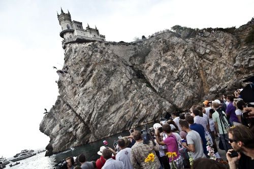 Надо сказать, что прыжки у "Ласточкина гнезда" вызвали у крымчан, да не только у них, огромный интерес. Народу понаехала уйма, все окрестные скалы были усыпаны людьми, как хорошая новогодняя елка игрушками - ярко, празднично! А в бухте возле "Ласточкина гнезда" собралась целая флотилия - от многопалубных прогулочных лайнеров до надувных матрасов. Говорят, что было 15 тысяч зрителей. Но, на мой взгляд, могло бы и больше, места на окрестных скалах кое-где оставались свободными. Однако милиция в целях безопасности многих разворачивала назад, неровен час сорвутся со скалы. Но рисковать стоило, посмотреть было на что.