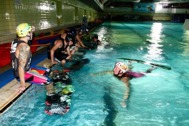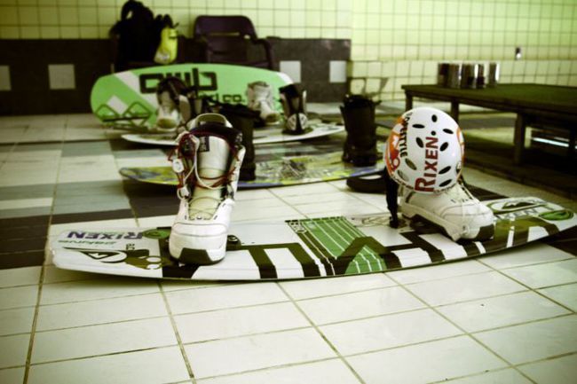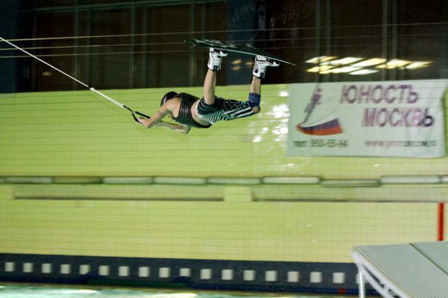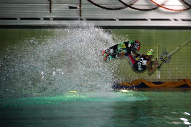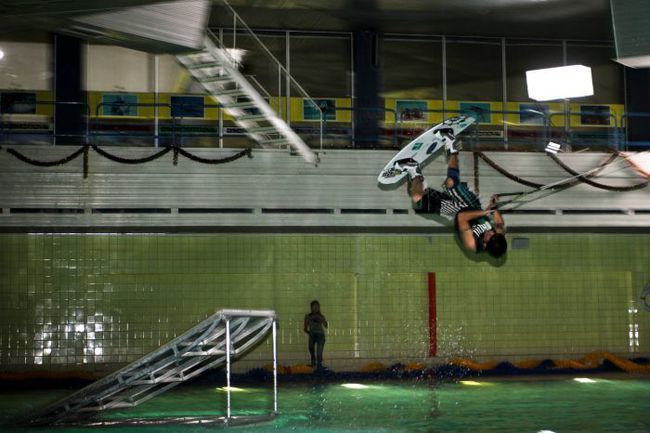 С наступлением холодов, столичные вейкбордисты перемещаются для тренировок с открытой воды в теплые плавательные бассейны. Таких, специально подготовленных мест (с протянутой под потолком лебедкой), в Москве всего три. К примеру, в ГЦОЛИФК установлены два троса буксирующих райдера. Один вдоль одного из бортиков (50 метров), а второй по диагонали всей ванны. На нем и прошли съемки. В джем-сессии принимали участие: