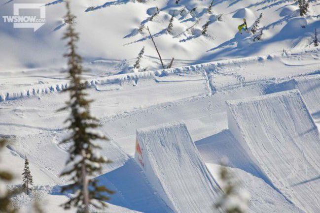 Проезд Тревиса состоял из огромного straight air, backflip с одной из фигур парка, backside 5 и cab9, приземленного в целину. Гиги Рюф выполнил double pillow tap, frontside 3, затем сразу straight air и backside 3, а завершил свой проезд frontside 7 на главном трамплине. На третьем месте оказался Николас Мюллер с серией gap - backside 3 - backside 5 - switch backside 3.
