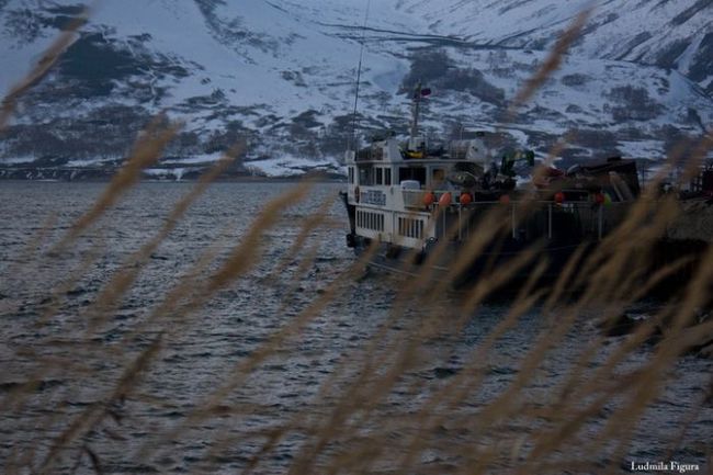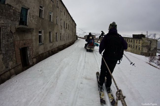 Утро мы встретили в бухте Моржовая. Позавтракав, мы загрузили лыжи и доски в моторные лодки и направились к берегу. В отличие от города, в том районе еще достаточно много хорошего весеннего снега, благодаря чему мы сделали хороший спуск. К обеду вернулись на "Омегу", а пока переодевались и раскладывали по местам снаряжение (на это ушло примерно 30 мин.), ребята из команды экипажа наловили камчатского краба и морских ежей. Далее по плану мы зашли в соседнюю бухту посмотреть на лежбище сивучей. Впервые в жизни я находилась так близко к этим животным, в их естественной среде обитания. Когда "Омега" пришвартовалась к разбитому причалу, уже темнело, но небольшая компания отважных и любознательных все-таки собралась прогуляться в заброшенный город. Зашли в первые два дома на окраине. Должна сказать вам, прогулка не для слабонервных. Жутко бродить в темноте по сырым, холодным квартирам, среди брошенных и забытых вещей. Под ногами скрежет разбитого стекла, кругом мусор, старые бутылки, сломанные шкафы, выбитые оконные рамы, телевизоры и так невзначай захлопывающиеся от сквозняков входные двери. И самое жуткое — повсюду были разбросаны детские башмачки и сломанные игрушки. Вообще, во всем городе редко встречались вещи взрослых, а вот детских вещей, а особенно обуви, было очень много. В связи с чем я прозвала это место "город детских башмачков".? На следующий день мы организовали полноценный выход в город, с самого утра и до вечера, с целью обойти его со всех сторон. Заходили в жилые дома. Были в гастрономе, где, по рассказам очевидцев, в былые времена висели гирлянды из ананасов. Побывали в школе. Заглянули в кабинет химии, потом в актовый зал и в спортзал. Были в госпитале. Зашли в операционный зал, в умывальную, обошли еще несколько кабинетов, нашли сочинения Ленина, валяющиеся в куче снега и побелки (двадцатый том и несколько пуговиц с якорями я забрала на память). Были на кочегарке, где до сих пор лежит гора угля. В общем, прошли через весь город, чем я полностью была довольна, и к вечеру вернулись обратно на корабль.