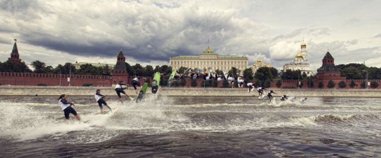 Прохожих, которые ранним утром проходили по Кремлевской набережной, где еще не успели разобрать трибуны после проходившего в выходные Moscow City Racing, ждало новое шоу. По Москва-реке с ревом носился катер MasterCraft, – такой же, как и на главных мировых соревнованиях по вейкбордингу, а за ним летал по волнам, выполняя невероятные трюки, вейкбордист в белом жилете. Девятикратный чемпион России и призер мировых чемпионатов Никита Мартьянов стал главным героем нового проекта Red Bull Kremlin Wake. Пожалуй, впервые в России для съемок спортивного события использовалось такое количество профессиональной техники, включая камеру высокого разрешения Red Epic и камеру Phantom, способную снимать до 20 000 кадров в секунду.